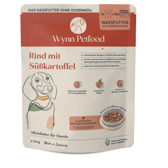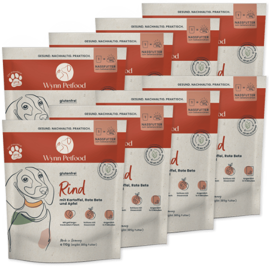 Um die richtige Futtermenge für deinen Hund bei Nassfutter zu berechnen, orientiere dich am Gewicht und der Aktivität deines Hundes. Hersteller geben oft eine Fütterungsempfehlung auf der Verpackung an, die du als Ausgangspunkt verwenden kannst. Generell benötigt ein erwachsener Hund etwa 3% seines Körpergewichts an Nahrung pro Tag. Ein aktiver Hund benötigt mehr, ein weniger aktiver weniger. Zudem spielen auch das Alter und das Geschlecht eine Rolle bei der Futtermengenberechnung. Da Trockenfutter in der Regel energiedichter ist, musst du bei Nassfutter im Vergleich größere Mengen füttern. Für unsere hochwertiges und natürliches Nassfutter bieten wir einen individuellen Futterrechner an, mit dem du die Futterration für deinen Hund unkompliziert berechnen kannst. Achte darauf, die Futtermenge regelmäßig anzupassen, um sicherzustellen, dass dein Hund sein Idealgewicht hält. Bei Unsicherheiten konsultiere bitte einen Tierarzt.